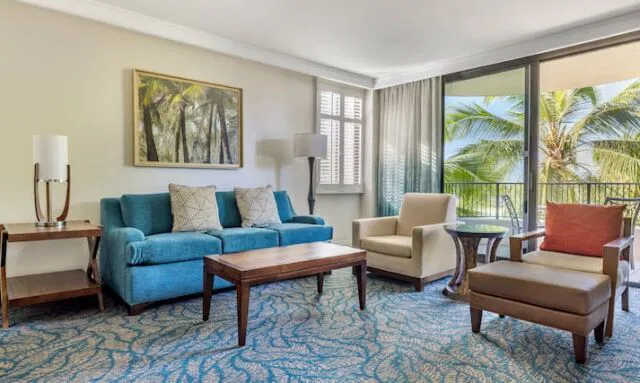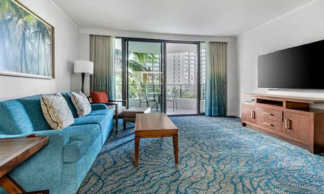 This spacious one-bedroom, one-bathroom city view suite with balcony features a primary bedroom with king-size bed and bathroom with a standard shower/tub combination and TOTO washlet. The suite includes a generous living room with separate dining area, TV with cable, PlayStation 3, and queen-size sleeper sofa, as well as a. full kitchen with rice cooker.